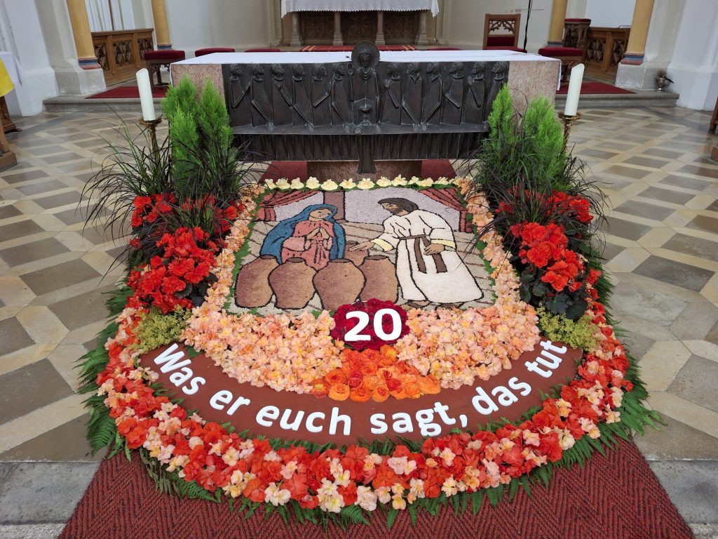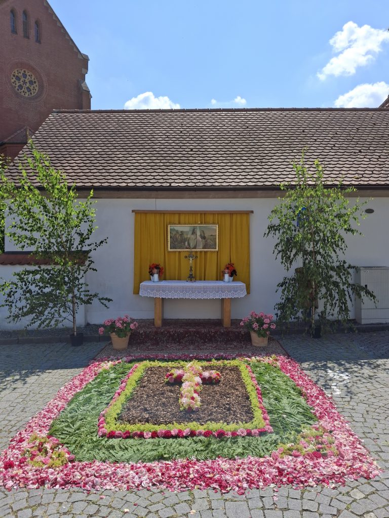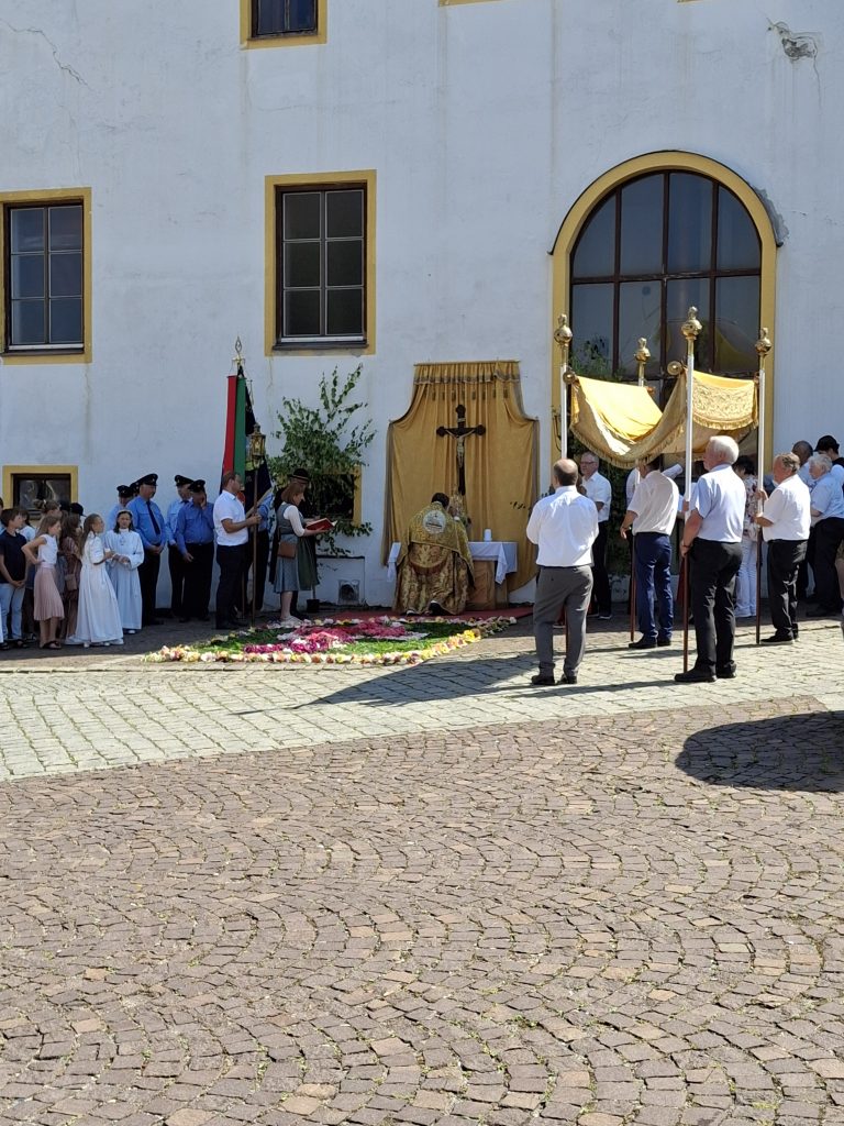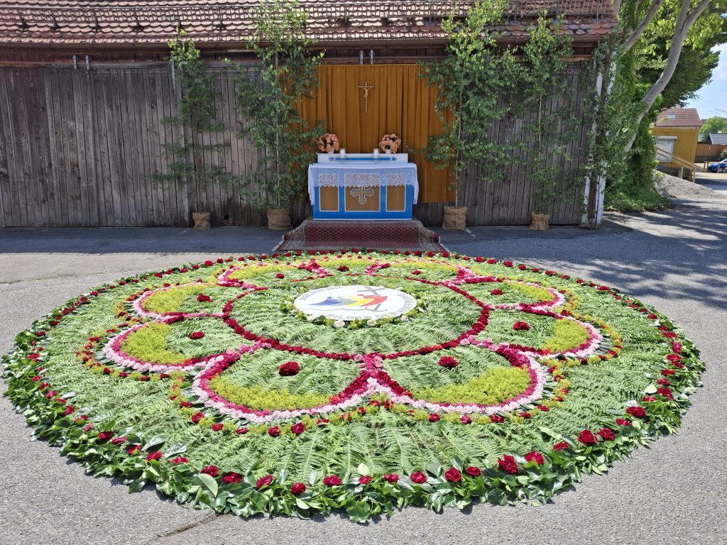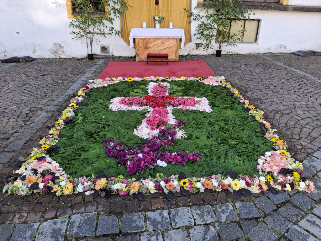 Heuer konnte das Hochfest des Leibes und Blutes Christi wieder mit einer feierlichen Prozession begangen werden. Die Erstkommunionkinder und Firmlinge und alle Vereine mit Fahnenabordnungen sowie die Gläubigen zogen gemeinsam mit dem Allerheiligsten zu den vier Altären. Hier waren wieder prachtvolle Blumenteppiche, gestaltet von der Kolpingsfamilie, dem Frauenbund und dem Pfarrgemeinderat zu bewundern.