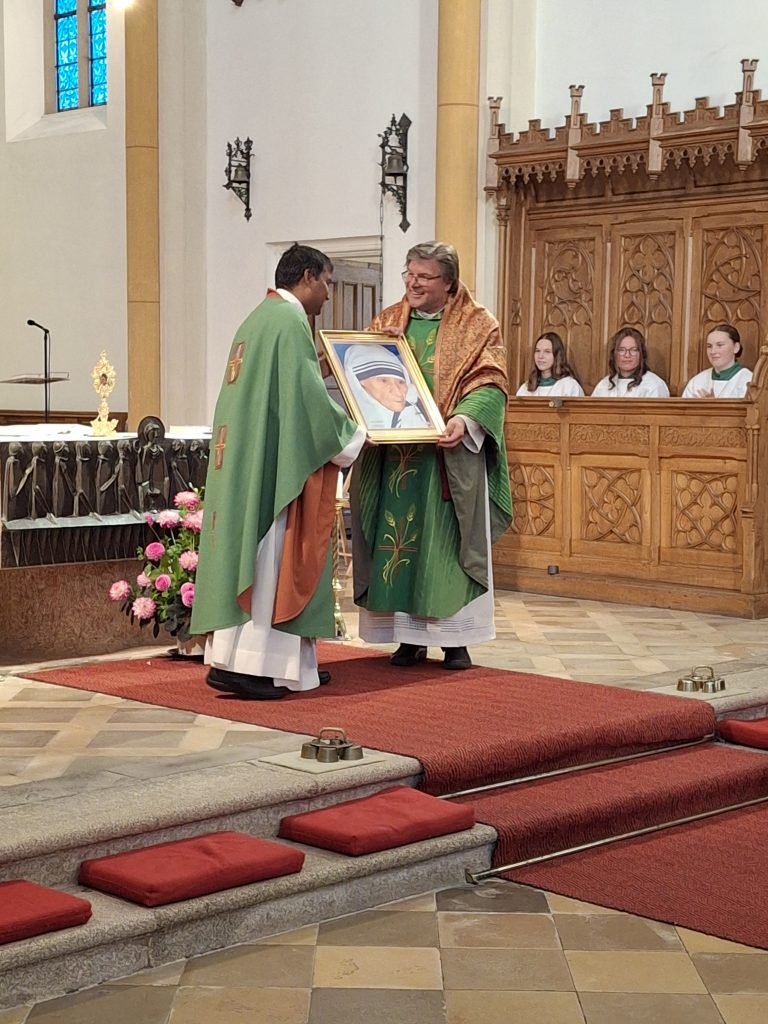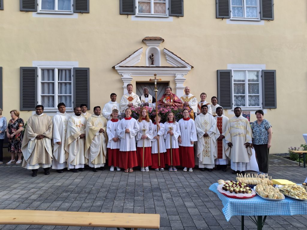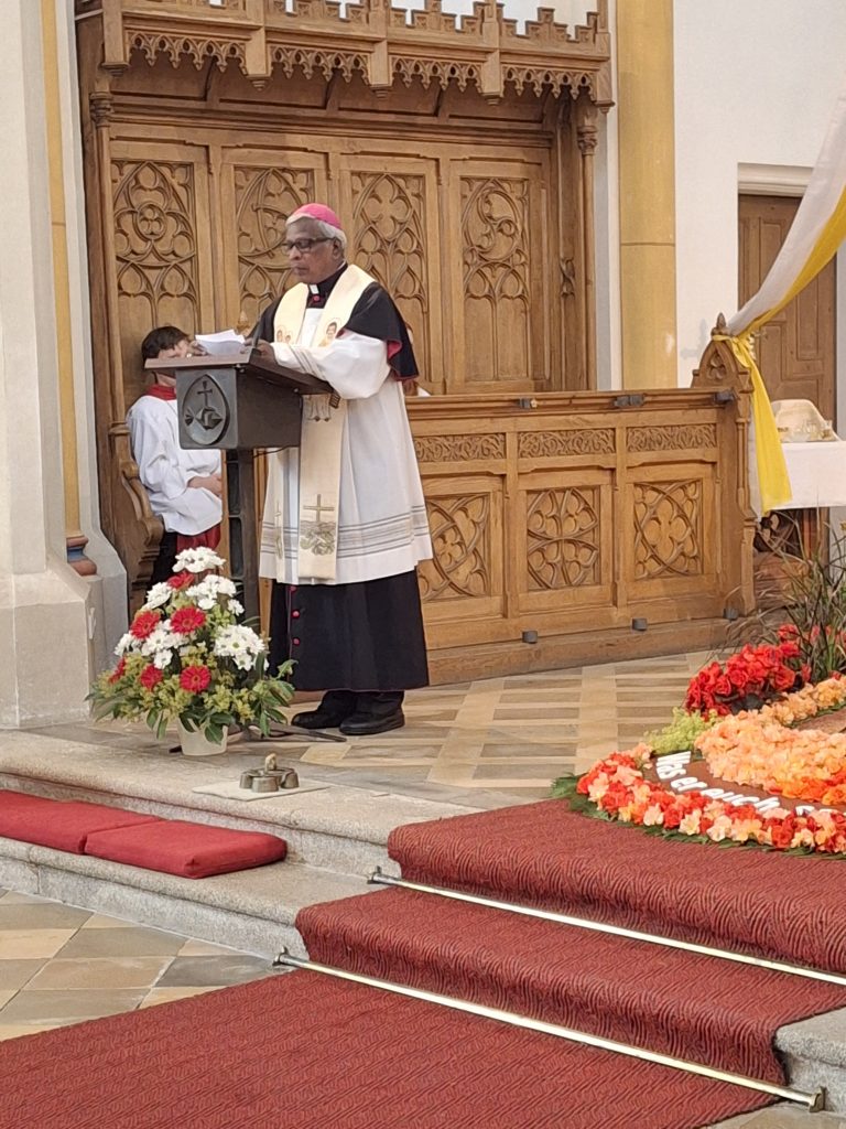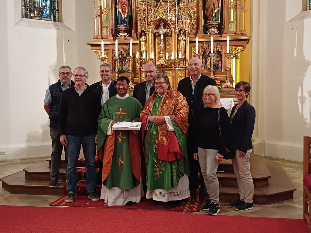 Am 25.06.2025 wurde mit einem feierlichen Dankgottesdienst das 20-jährige Priester- jubiläum von Bischöflich Geistlichen Rat Pfarrer Günter Müller gefeiert. Bischof Moses Prakasam und viele Priesterkollegen und Kapläne feierten einen feierlichen Dankgottes- dienst in der Pfarrkirche St. Martin. Bischof Moses würdigte in der Festpredigt die Verdienste von Pfarrer Müller und sein großes Herz und stetige Unterstützung für die Diözese Nellore. Aber auch seiner väterlichen Fürsorge für die 10 indischen Priester- anwärter bis hin zur Priesterweihe hob der Bischof hervor. Auch Kirchenpfleger Josef Högl gratulierte im Namen der Gremien der einzelnen Pfarreien und überreichte ein gemeinsames Geschenk. Ein wunderschöner Blumenteppich, gestaltet von der Familie Geltinger mit den Primizspruch „Was er euch sagt, das tut“, war vor dem Altar aufgebaut. Ein Stehempfang im Pfarrgarten mit der Bewirtung durch den Pfarrgemeinderat bildete einen würdigen Abschluss.