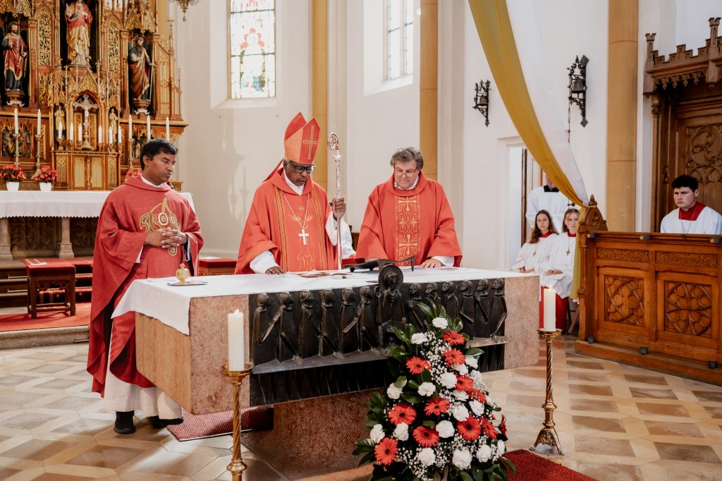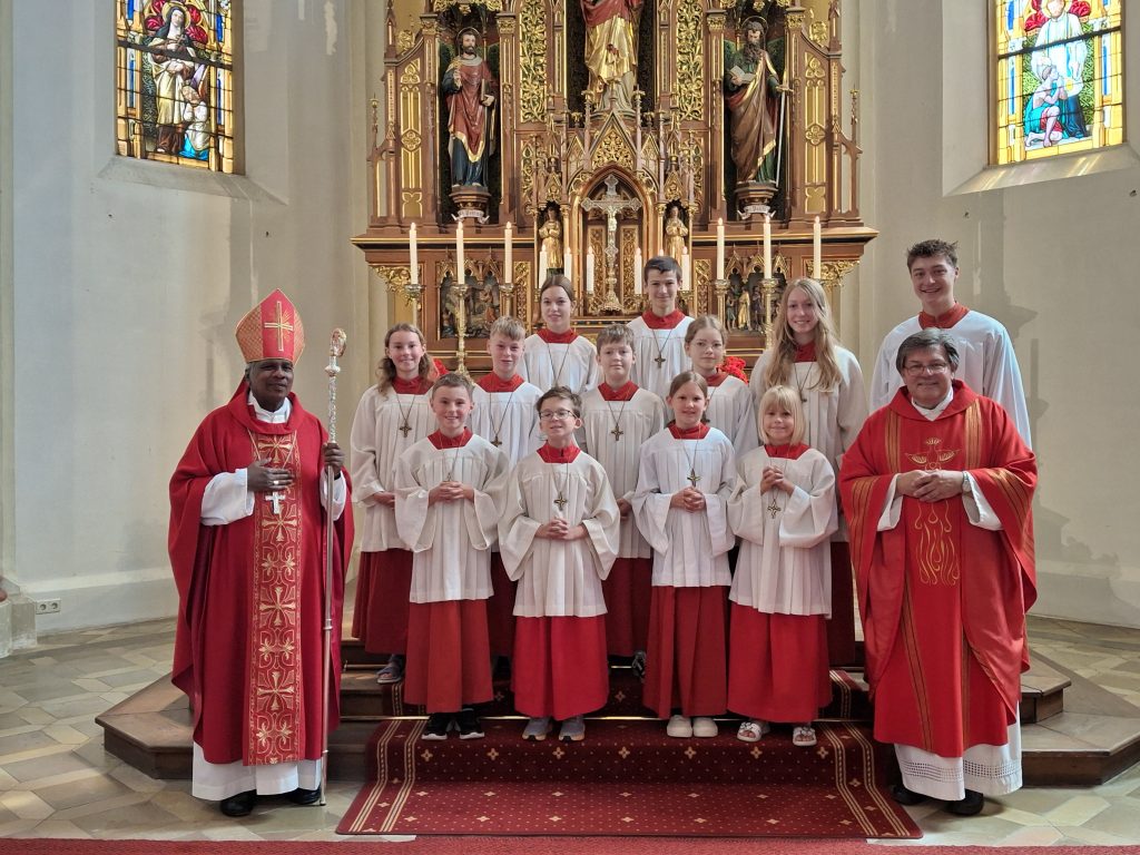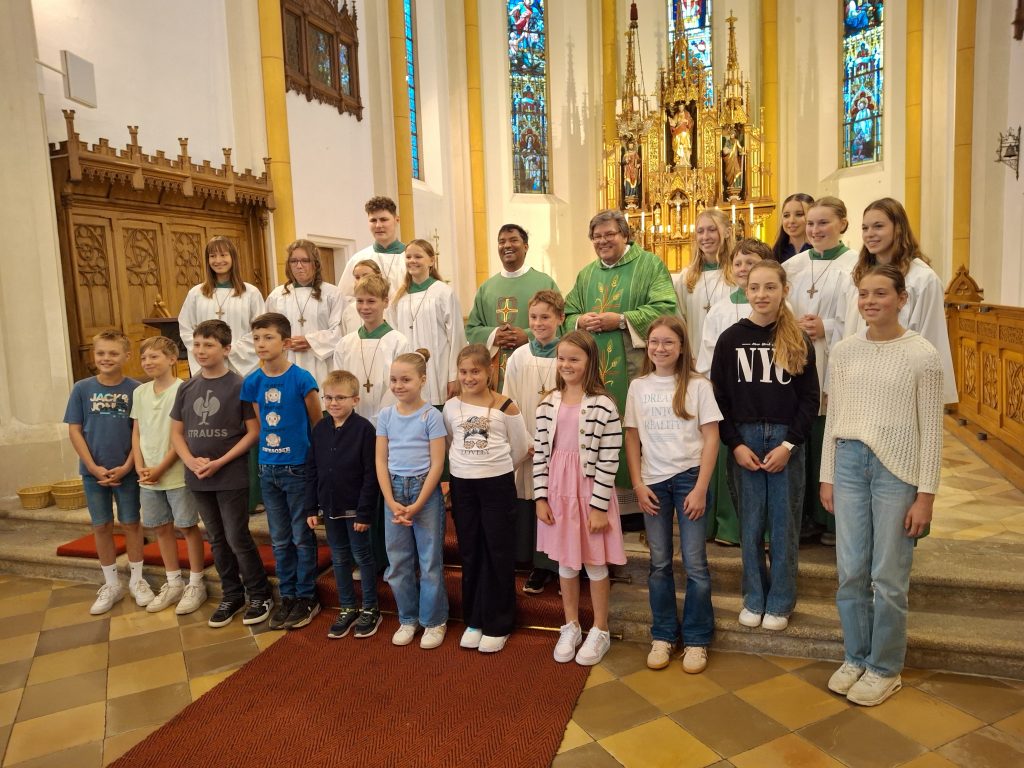 Am Sonntag, 29.06.2025 feierte Bischof Moses Prakasam gemeinsam mit Bischöflich Geistlichen Rat Günter Müller in der Pfarrkirche St. Martin in Pfeffenhausen den festlichen Pontifikalgottesdienst. Der indische Bischof besuchte wieder die Pfarreiengemeinschaft und wird in der Diözese Regensburg auch wieder einige Firmungen spenden, darunter auch an 55 junge Christen aus der Pfarreiengemeinschaft. In seiner Predigt ging Bischof Moses am Festtag der Apostel Petrus und Paulus, auf deren Bedeutung für die Geschichte der Kirche ein. Weiter erfuhren die Gläubigen einiges über seine Projekte in der indischen Diözese Nellore. Neben der Versorgung von kranken Menschen ist das Hauptanliegen seiner Hilfsprojekte, die Schaffung von Bildungseinrichtungen für Kinder und Jugendliche. Frei nach dem Motto: „Warum sollen die Kinder der Ärmsten nicht die gleichen Chancen bekommen, als die anderen Kinder“, wird seit vielen Jahren versucht, diesen zu helfen. meinte der Bischof. Er dankte hierfür auch für die finanzielle Unterstützung aus der Pfarreiengemeinschaft, die er immer wieder erfahren dürfe. Im Rahmen des Gottesdienstes wurden auch vier neue Ministranten aufgenommen und der Kirchengemeinde vorgestellt. Pfarrer Müller zeigte sich erfreut, dass diese zukünftig als „Diener Gottes“ die Pfarrei unterstützen werden. Er dankte auch den Oberministranten für die gute Einarbeitung. Nach Segnung der Umhängekreuze wurden diese an Luisa Butz, Nele Schreiber, Nico Stöckl und Michael Forsthofer überreicht.