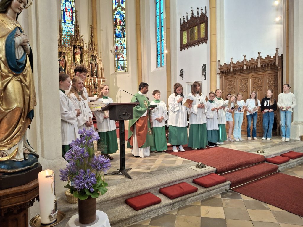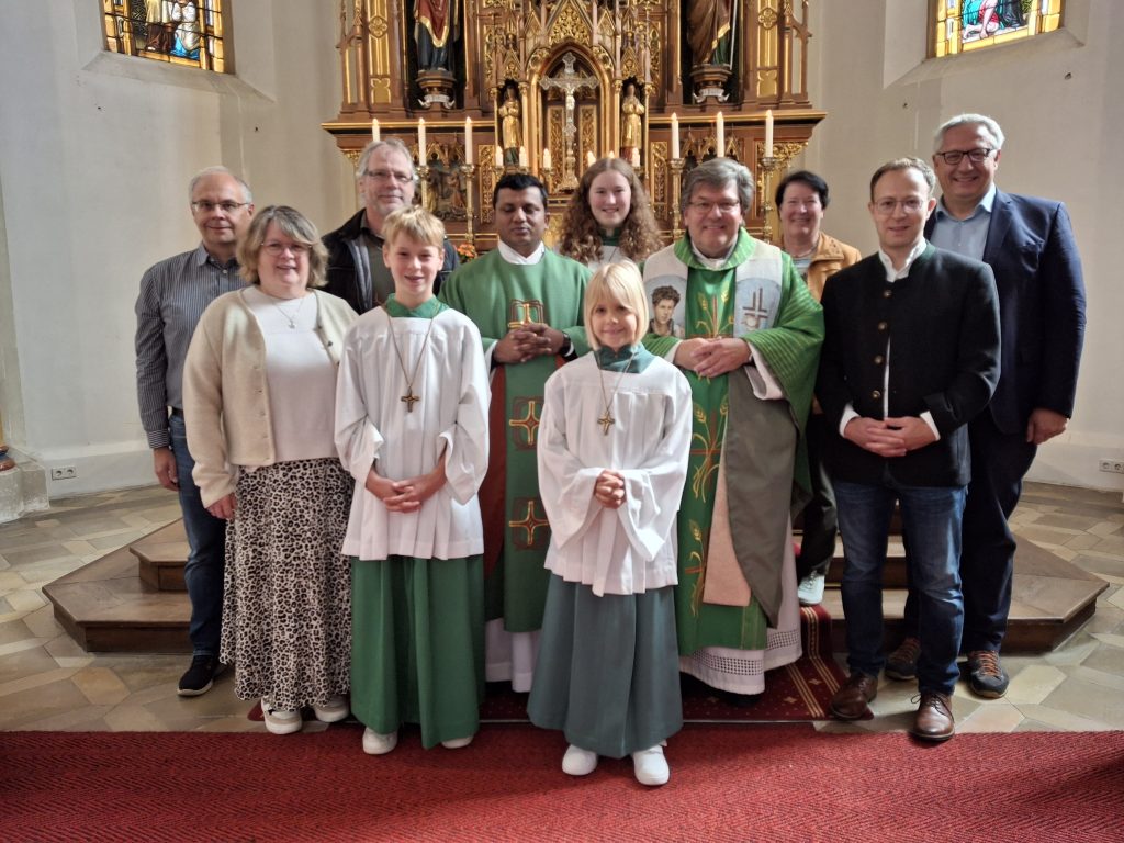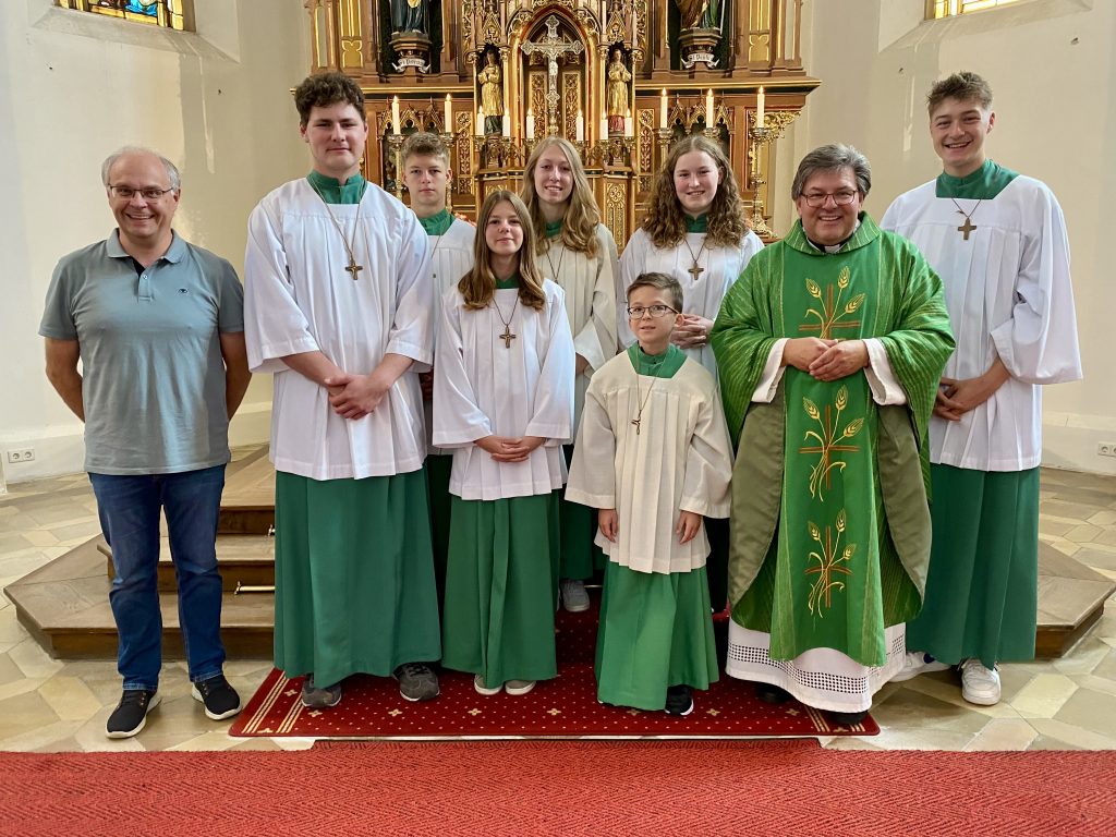 Im Rahmen des Sonntagsgottesdienstes wurden drei langjährige Ministranten der Pfarrei Pfeffenhausen feierlich aus ihrem Dienst verabschiedet. Bischöflich Geistlicher Rat Pfarrer Günter Müller dankte Jakob Wensauer, Philipp Schiller und Jennifer Schiller herzlich für ihren jahrelangen treuen Einsatz am Altar.Jakob Wensauer war ganze zehn Jahre als Ministrant tätig und hatte in den letzten Jahren zudem das Amt des Oberministranten inne. Philipp Schiller stand der Pfarrei neun Jahre und Jennifer Schiller acht Jahre als Ministrant zur Seite. Als Zeichen der Anerkennung überreichte Pfarrer Müller den drei scheidenden Ministranten jeweils eine kleine Aufmerksamkeit und würdigte ihr Engagement mit persönlichen Worten des Dankes. Er hoffe, so Müller, dass sie sich auch weiterhin in der Pfarrei engagieren und am Pfarrleben tatkräftig teilnehmen. Für die Zukunft der Ministrantengruppe ist ebenfalls gesorgt: Lea Wirth und Veronika Scharf übernehmen künftig das Amt der Oberministrantinnen. Josef Scharf steht ihnen dabei als Stellvertreter zur Seite. Mit einem kräftigen Applaus aus der Gemeinde wurde der feierliche Moment abgerundet. -