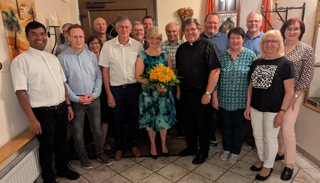 Im Rahmen einer kleinen Feierstunde wurde die langjährige Pfarrsekretärin Rita Hyronimus in den wohlverdienten Ruhestand verabschiedet. Bischöflich Geistlicher Rat Günter Müller bedankte sich für die fast 15-jährige Tätigkeit im Pfarrbüro und meinte, mit ihrer Freundlichkeit und Herzlichkeit war sie stets die gute Seele des Pfarrbüros. Er konnte sich stets auf die sie verlassen und schätzte vor allem ihre Kompetenz und ihr großartiges Engagement, das weit über die die Arbeitszeit hinausging. So war es auch eine Selbstverständlichkeit für sie, ihre Nachfolgerin Christine Bichlmayer bestmöglich in die Aufgaben in der Pfarrverwaltung einzuführen. Im Namen aller anwesenden Kirchenverwaltungsvorstände und Pfarrgemeinderatsvorsitzenden der Pfarreien-gemeinschaft überreichte Pfarrer Günter Müller, zusammen mit Kirchenpfleger Josef Högl ein Geschenk an Rita Hyronimus und wünschte ihr alles Gute, Gesundheit und Gottes Segen für den Ruhestand. -